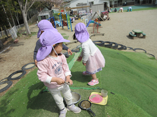お外では、どろんこあそびが始まり、水たまりに桜の花びらを浮かべたり、水をスコップで運んでもう一つ水たまりを作ったり…。夢中で遊ぶこどもたちがかわいらしいです。子どもたちの好きなことを思いっきり楽しむ1年にしていきたいです。
