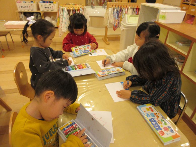 敬老のプレゼントに向けて絵を描くこどもたち。「これは○○!」「○○かいたんだよ」と教えてくれる子もおり、友だちと描いた絵を共有する姿も…!中には、お父さんやお母さんにも絵をプレセントしたい!という子の姿も見られ、夢中になって絵を描いていたすみれさん。どんなプレゼントが届くのか、楽しみにお待ちくださいね♪