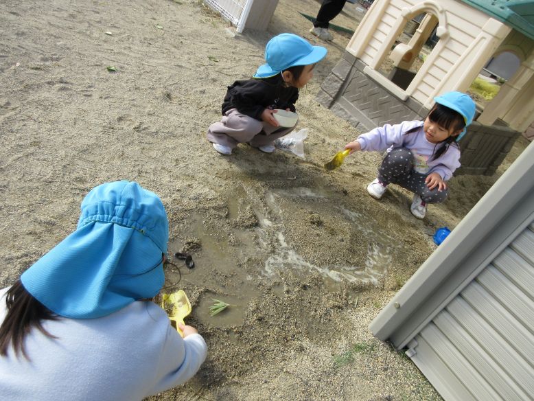 園庭では落ちている葉っぱや木の実に夢中になるこどもたち!たくさん拾った木の実を「これ育てたら大きくなるかな…!」と地面に埋め、水を上げる様子も!いろんな遊び方や“これはどうなるかな?”と興味を持って遊びが広がっていく姿に感心しました。