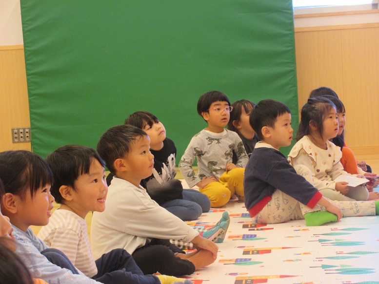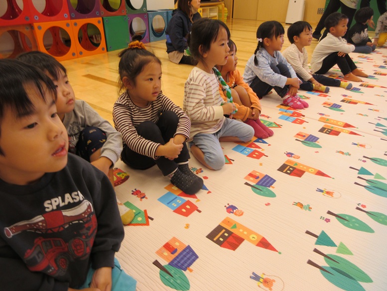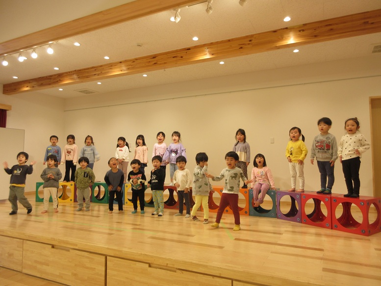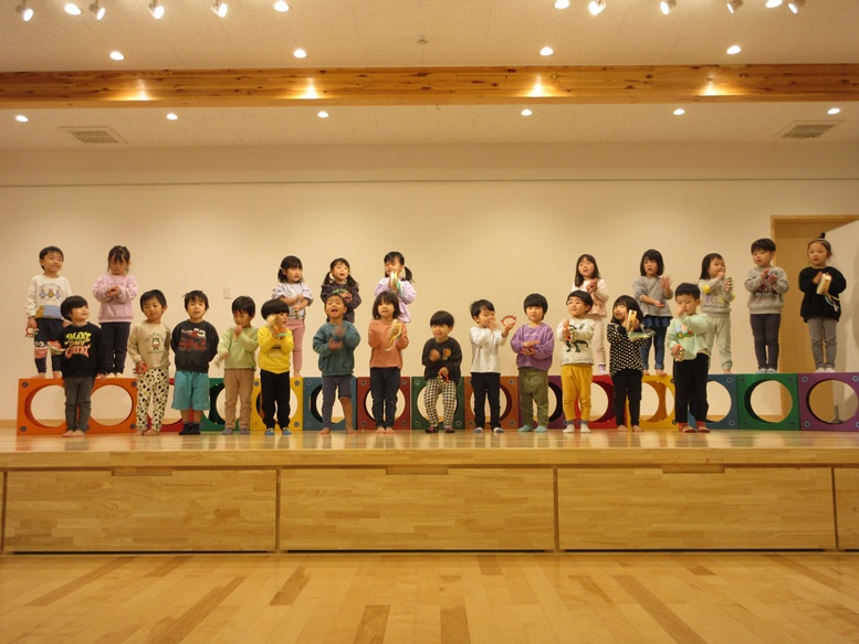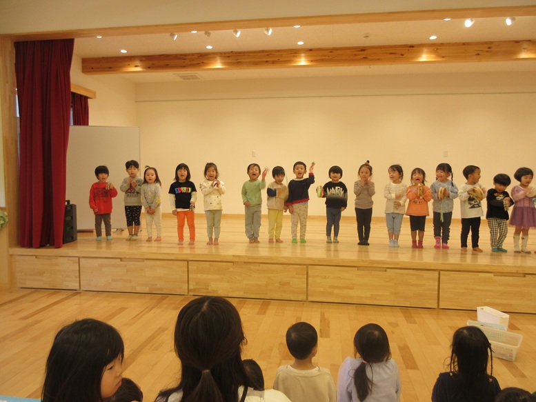 今日はゆりぐみさんがホールで練習しているのを見て興味を持ったこどもたち。お客さんとして、ゆりぐみさんの劇や歌、楽器などを見ました。終わってから給食まで少し時間があったので、こどもたちと話し合ってすみれぐみさんもホールで歌や楽器あそびをすることに。ゆりぐみさんがお客さんをしてくれたのですが、終わってから「楽しかった~」「またしようね!」という子も多かったのですが、「ゆりさんに見られてドキドキしちゃった~」という子もいましたよ。