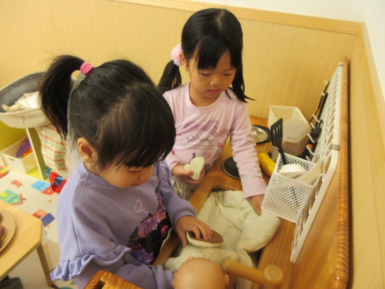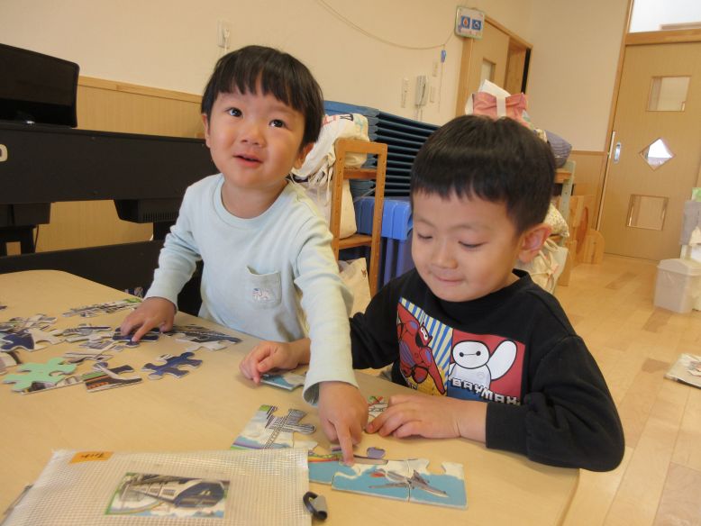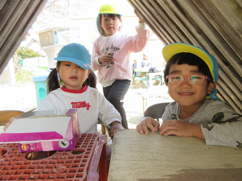 友だちと誘いあってみんなで一緒に遊ぶことを楽しんでいます。おままごとや戸外遊びでのこどもたちの会話を聞いていると、「これはこうだよね」「こうしてみようよ!」と試行錯誤しあって遊んでいます。