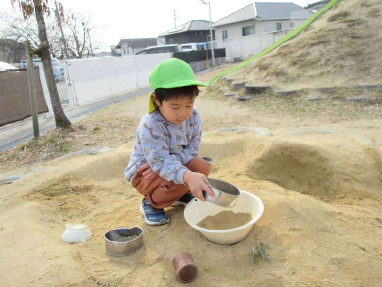 最近築山近くの砂山で砂遊びをするのがブームのこどもたち。スコップを持ってきて穴を掘ったり、さら砂作りをしたりして楽しんでいます。少人数で集中して楽しむ姿が見られ、今日はボウルいっぱいにさら砂を集めていましたよ。
