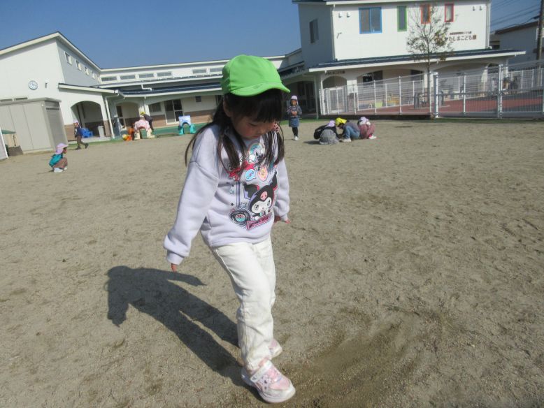園庭を歩いていると、地面をじっと見つめるゆり組さん。「みて、足跡いっぱいある!」と靴の跡に興味津々。自分の靴を地面に押し付けて、大きさや模様の形の違いをじっくり観察していて、面白い着眼点だな~と思いました。