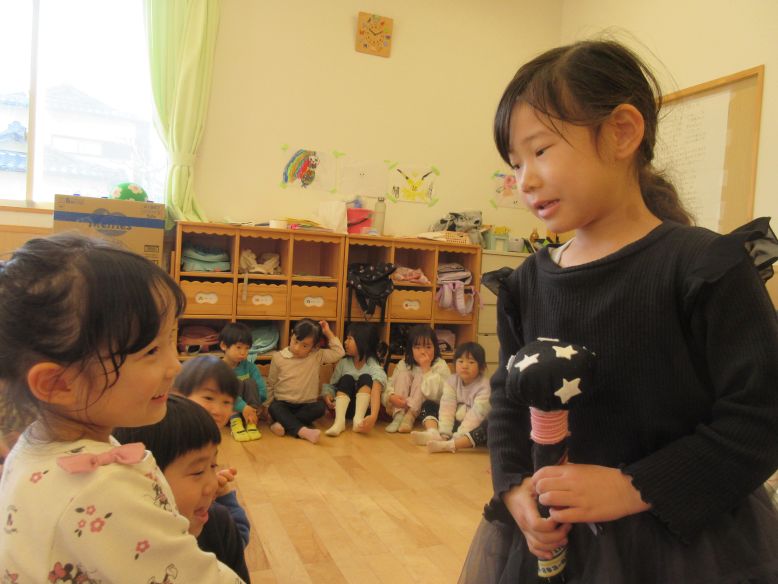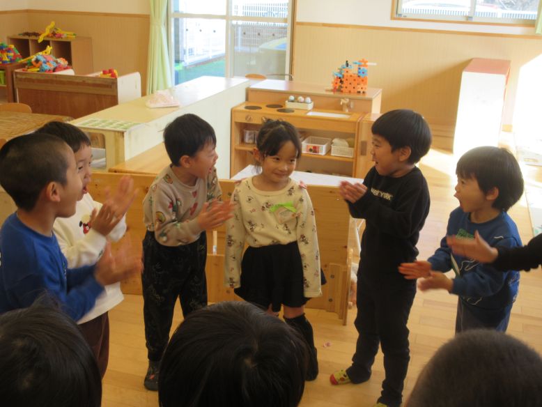 保育室では、日曜日が誕生日のお友だちの誕生日会をしました。みんなにお祝いされて照れながら「ふふ~」と嬉しそうに笑っていて、とても可愛かったですよ!最後はみんなが大好きなジャンケン列車で大盛り上がりでした。
