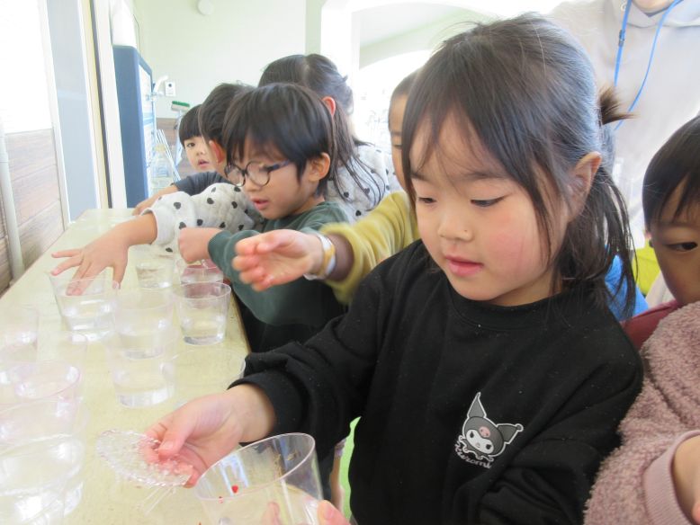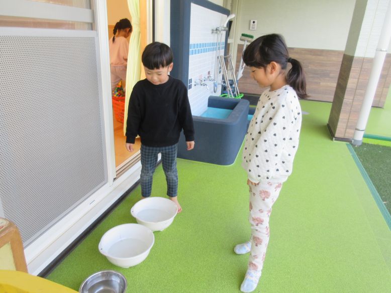 昨日水を入れたボウルをプールサイドに用意したので、朝から窓を開けておくと覚えていた子たちが自分で氷ができたかどうか確認しに行く姿が見られました。「まだ氷になってなかった」「ゆらゆらしてるから水のままやった!」と、と保育者や友だちに教えてくれて、他の子も思い出して確認しに行っていました。朝の会で、どうして氷になっていなかったのかみんなで考えました。「こんなに寒いのになんでだろうね」とみんなで考えていると、「影のとこに置いておくといいんじゃない?」「家で作ったことあるけど、朝早くじゃないと溶けるよ!」と教えてくれた子がいたので、明日からは日陰にボウルを置き、気になる子は登園してすぐに確認しに行くことになりました。こどもたちが自分で考えて、今までの経験を踏まえて意見を話す姿がとても素敵でだなぁと感じました。
