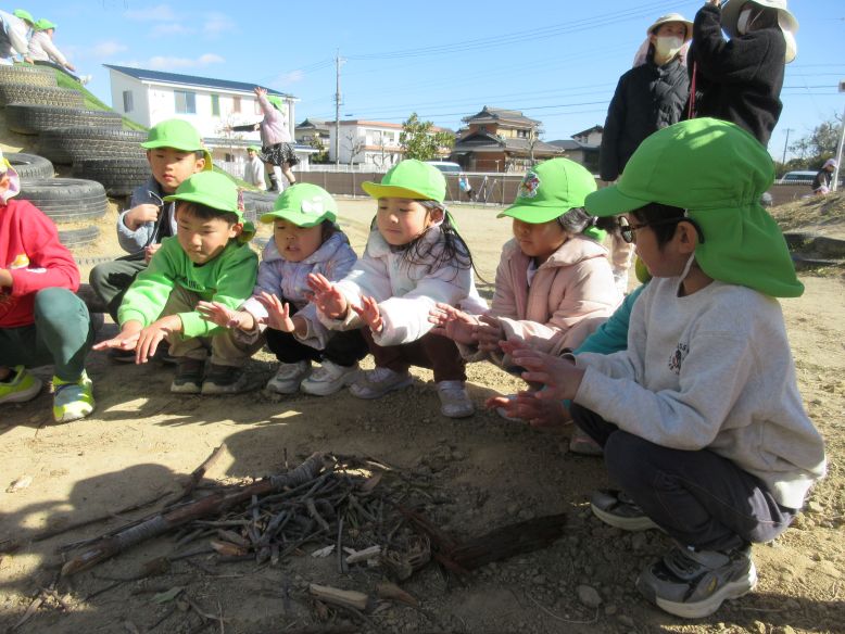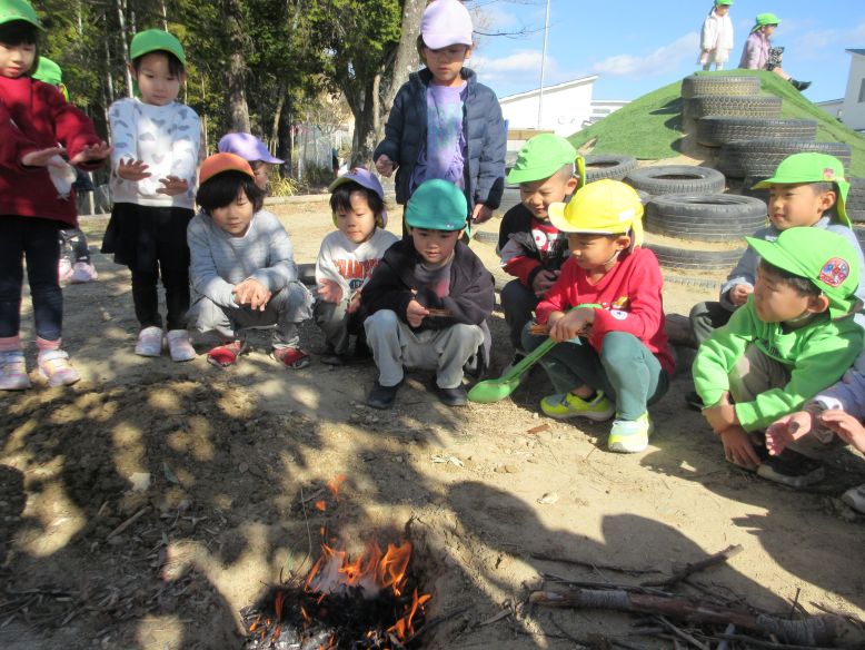 築山近くの砂山に行ってみると、真剣な表情で何かをしているゆり組さんを発見。見に行ってみると、掘った穴に枝を沢山集め、焚き火の準備をしていました。丸太を持ってきて近くに座れるようにして、火にあたれるように工夫する徹底ぶり。「今日寒いから焚き火したい。先生、火つけて!」と話すので、園長先生に一緒に焚き火をしても良いか聞きに行き、園庭に穴を掘って焚き火をしました。「細い木の枝や乾いた葉っぱがたくさんいるんだよ」と伝えると、「みんな、やるぞー!」「おー!!!」と一致団結して集めに行く姿が見られました。火が起きると手をかざして火にあたり、「あったか~い」と無事に温まることが出来ました。去年焼き芋をした経験から、「今日も何か焼ける?「焼き芋食べたい!」「マシュマロもいいな~」と話しており、また別日に楽しめたら良いなと思います。