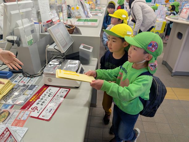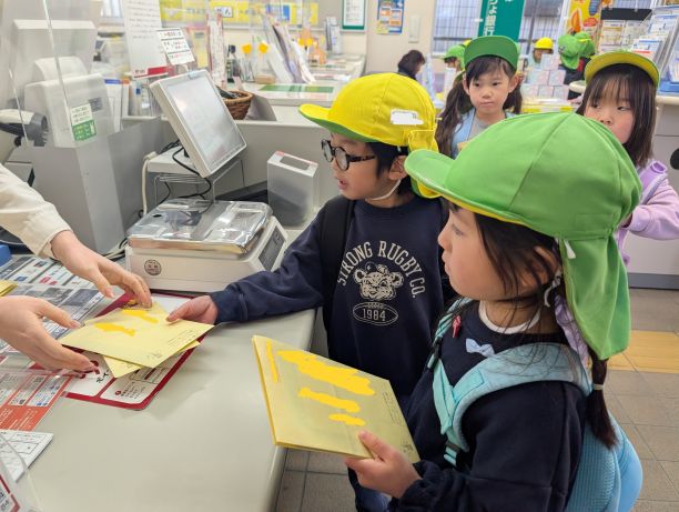 体育教室が終わってから、おじいちゃん、おばあちゃんへのお手紙を郵便局へ持って行きました。公園への道とは違い、たくさんの階段を昇ったり降りたりしたり、駅構内を通ったりしながら少し遠い郵便局まで頑張って歩きましたよ。郵便局では、順番に手紙を「おねがいします」と伝えながら局員さんに手渡しすることが出来ました。手紙が届くのがとても待ち遠しそうなゆり組さんでした。