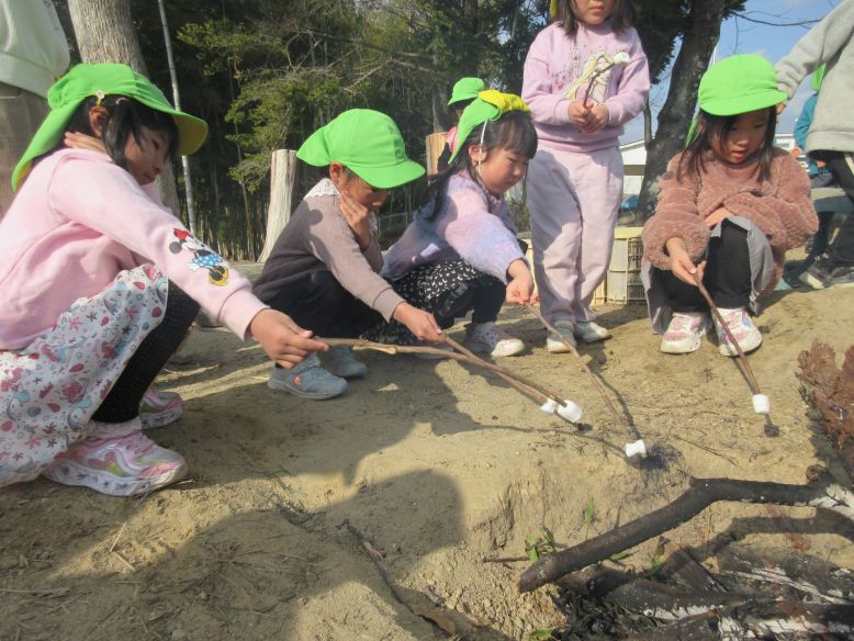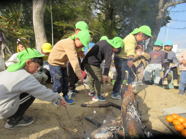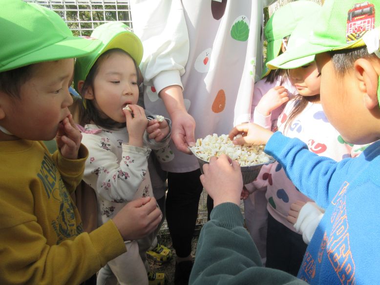 給食後少し休憩してから、いよいよ焚き火パーティーがスタート!火がつくと「あったか~い」「煙がモクモクだ!」と大興奮のこどもたち。念願の焼きマシュマロは、木の枝に刺して自分たちで焼いて食べましたよ。最初は火が怖かった子も、回数を重ねるにつれて自分で焼けるようになり、美味しそうに食べていました。他にもみかんやりんご、じゃがいも、サツマイモなども焼いて、「おいしい!」「もっと食べたい!」と言いながら沢山食べていました。特にポップコーンは、蓋を開けた瞬間に「おお~!!」と歓声が上がる程大盛り上がりでしたよ。