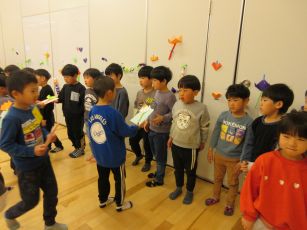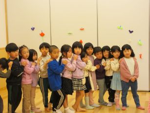 お別れ会では、みんなが大好きなジャンケン列車をしました。2回目は”いろいろジャンケン列車”にして、動物の鳴き声や乗り物の音で楽しみ、とても大盛り上がりでしたよ。頑張って練習をした歌も、今までで一番素敵な声で歌っていて、聴いているばら組さんも嬉しそうでしたよ。一生懸命書いたお手紙も無事に渡すことが出来、最後にハグをすると思わず涙ぐむ子もいて、とても温かいお別れ会になりました。
