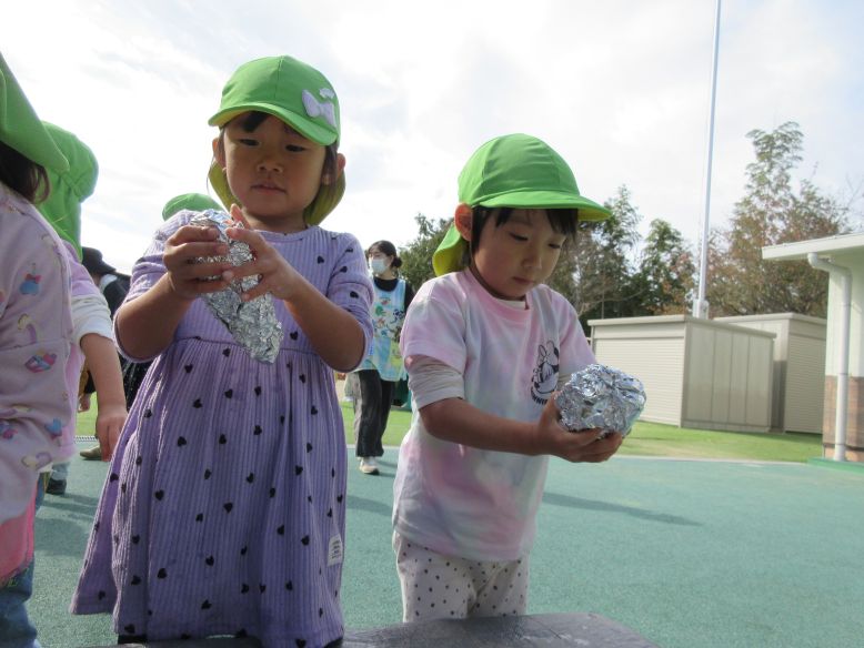 保育室に戻ると、ばら組さんから何やら良い匂いが…。お芋を料理していたので、少しだけおすそ分けをもらいました。保育園で採れたお芋で、甘くて美味しいと大喜びでしたよ。
