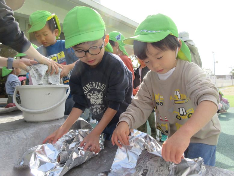 今日は園でとれたお芋で焼き芋パーティーです♪朝の会が終わってから、みんなでお芋の準備をしました。お芋についた土をお湯で洗い、新聞紙とアルミホイルで巻き巻き…。とても真剣な表情で、焼き芋の準備に参加してくれました。午後のおやつで食べるのが、とても楽しみなゆり組さんです。