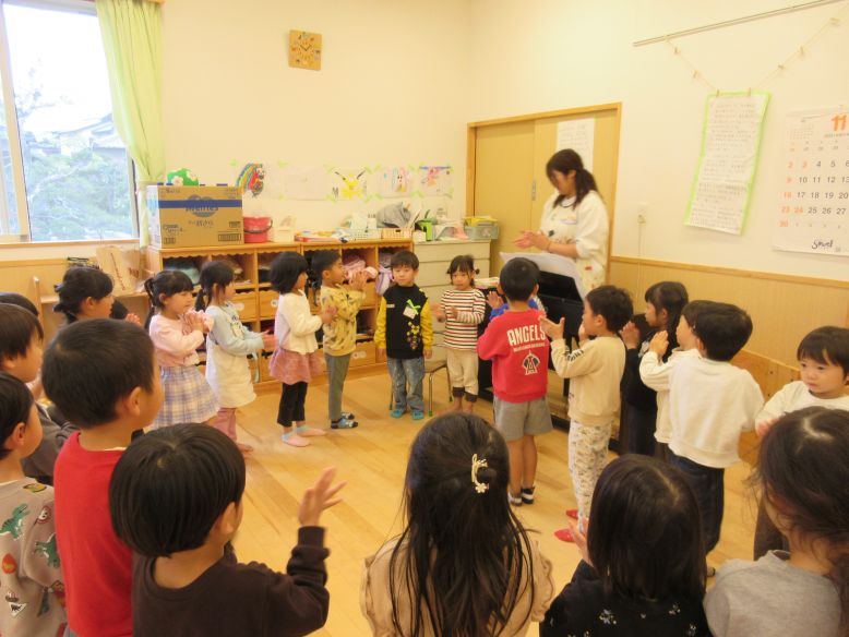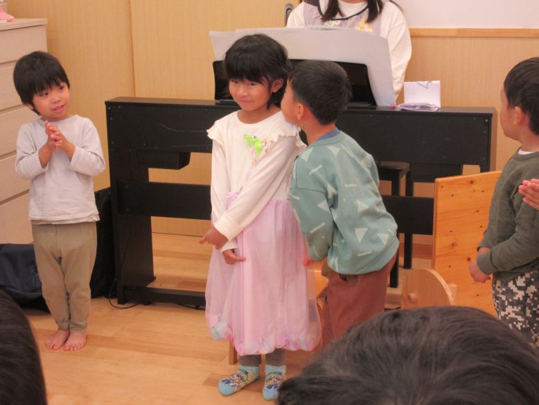 今日はリトミックでした♪少しずつやることが難しくなってきて、「これはどうやってやるんだ?」とリズムに乗るまでに時間がかかってしまっても子供たち同士で「これは1・2だ!」「これは1・2・3だ!」と声をかけ合いながら取り組んでいたゆり組さんでした。終始笑顔で楽しみ、部屋に帰って「どうだった?」と聞くと「ちょっとむずかしいけど楽しかった!」と言っていました。これからも楽しみながら音楽に触れることを大事にしていきたいです!