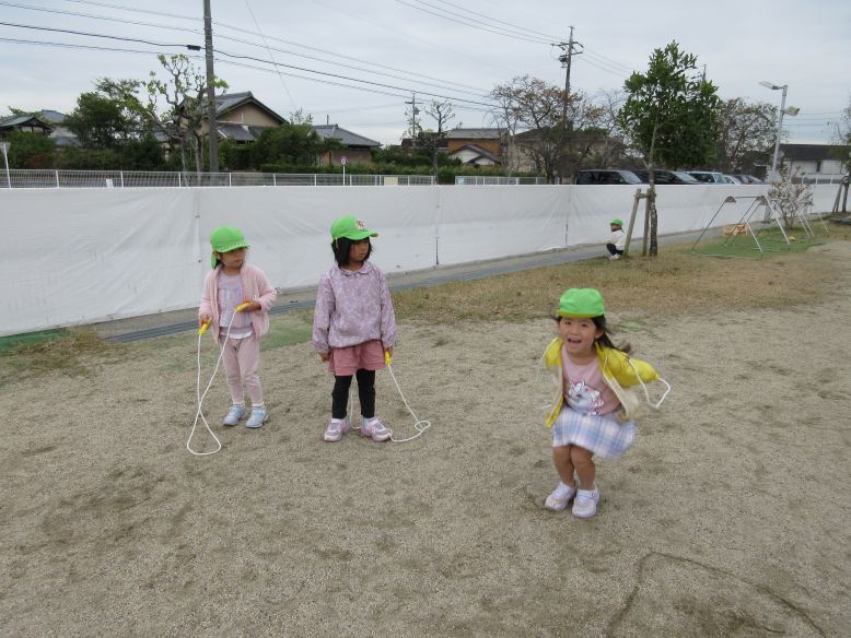 今日はお外で、縄跳びに力を入れるこどもたちの姿が見られました。「とぶからみててね」と言ってから、大きく縄を回してジャンプ!回す方向が逆だったり、引っかかったりしながらも、楽しそうに縄跳びをしていましたよ。上手に跳びたい気持ちが強い子もいて、引っかかると悔しくて涙を流す子もいました。悔しい気持ちがあるからこそ、これからどんどん跳べるようになるんだろうなあ、と感じ、とても楽しみになりました。