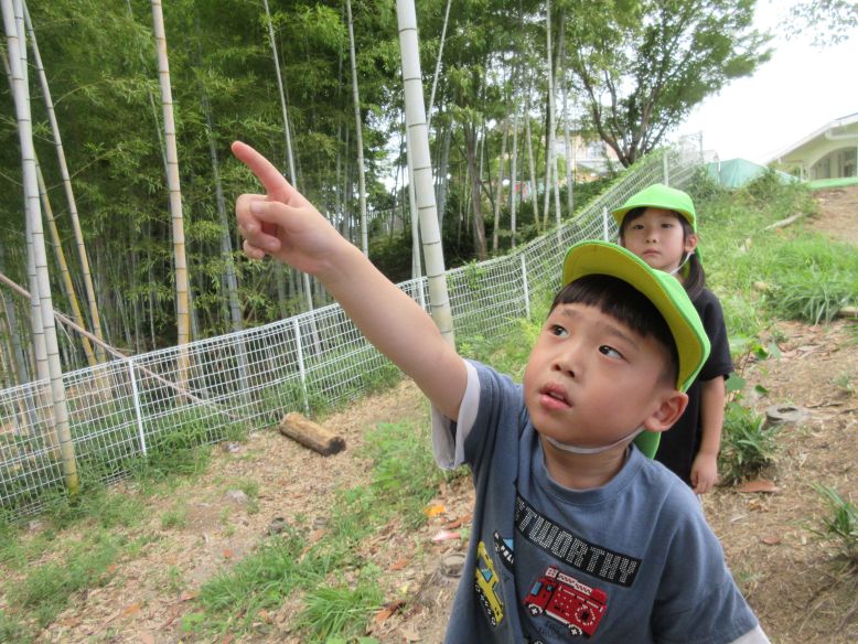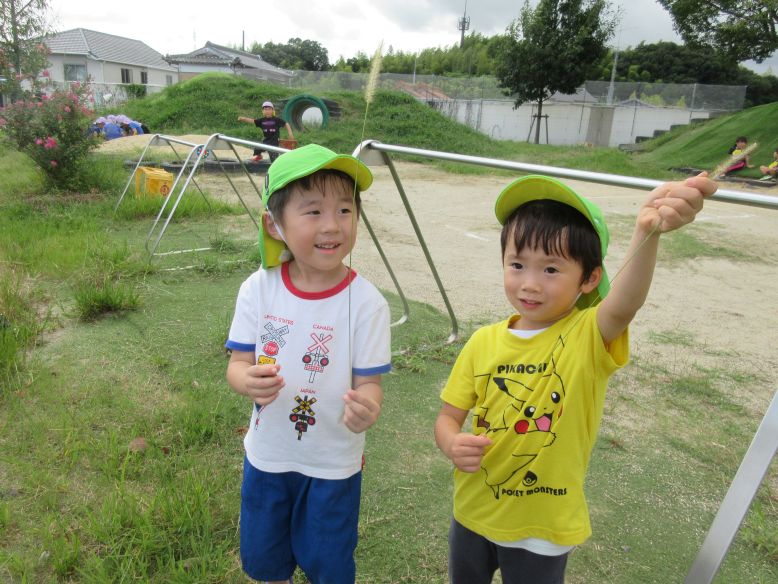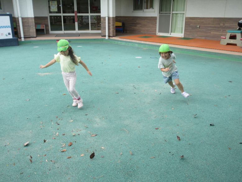 久しぶりにとても涼しかったので、園庭でたくさん遊ぶことができました♪しばらく遊んでいると、木に何かが実っているのを発見して「せんせい、あれとって」と伝えてきます。手が届かなくて取れないことを伝えると、「おおきくなったら、おちてくるかな…。でもたかくておみずあげられない…」と真剣に困ってしまいます。「じゃあ、根っこにお水をあげてみる?」と聞くと、パッと明るい顔になり、一生懸命水やりをしていましたよ。玄関前のテラスでは、ぐるぐる走り回るこどもたちを発見。何をしているのかと見ていると、風で舞っている葉っぱと追いかけっこをしていました。「はっぱとおいかけっこだー!」「まてー!」と無邪気に走り回るこどもたちに、とてもほっこりしました。虫取りを楽しんだり、猫じゃらしを見つけたりして、久々に外遊びを満喫したゆり組さんでした。