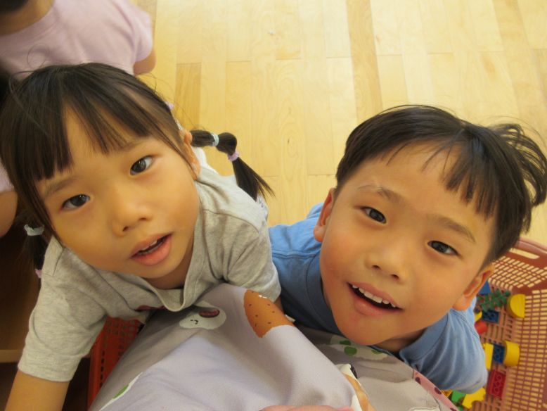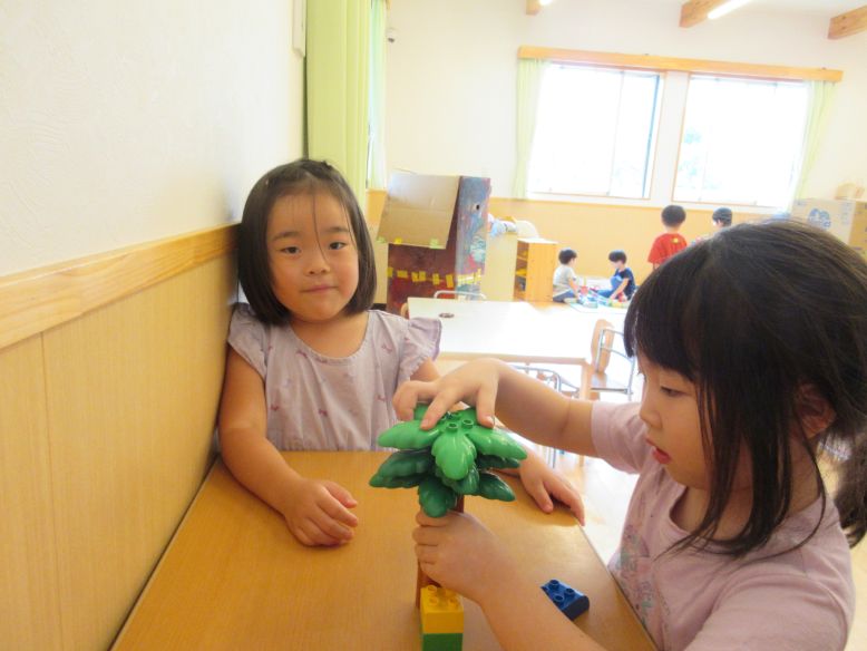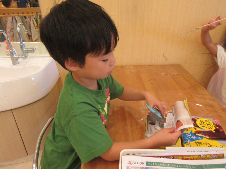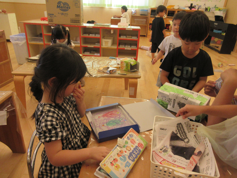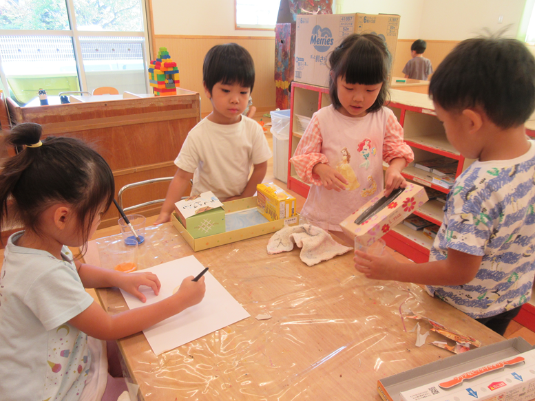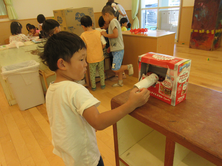 空箱で作る物がとってもリアルで面白くなってきています♪今日は、箱に一生懸命色んな色で塗っている子がいたので「なにつくってるの?」と聞くと「メイクするやつ!」と言っていました!その後は友だち同士で、指で目に塗ったり口に塗ったりする振りをしていました。ごっこ遊びもリアルになっているからこその作り物ですね。あと、”くじびき”を作っている子、”家”を作っている子などそれぞれが想像しながら作っているので、聞くのが楽しみです。またお家でも「なにつくったの?」と聞いてみてください♪