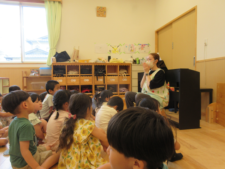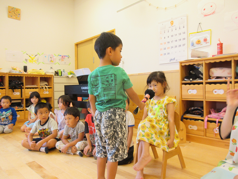 また、お誕生日のお友だちのお誕生日会をしました♪恥ずかしい気持ちもありながら一生懸命、質問に答えていましたよ!「すきなたべものはなんですか?」とお友だちからの質問があると「けーき!」「ぶとうジュース!」と答え、みんなが「ぼくもすきすき!」と言っていてほっこりとしたお誕生日会でした。