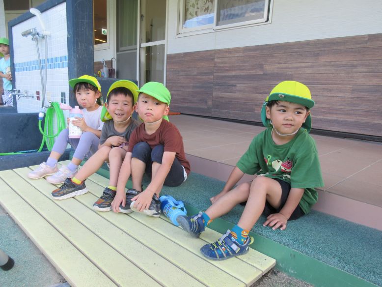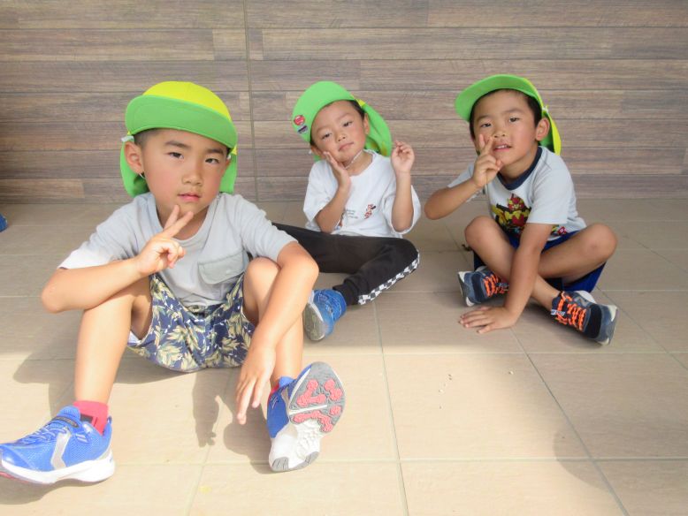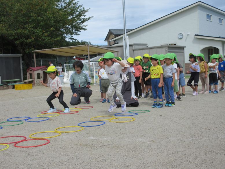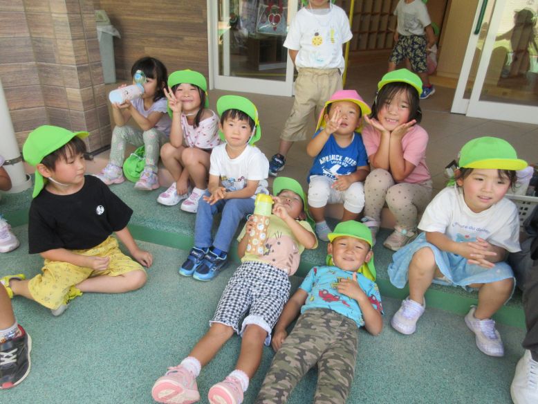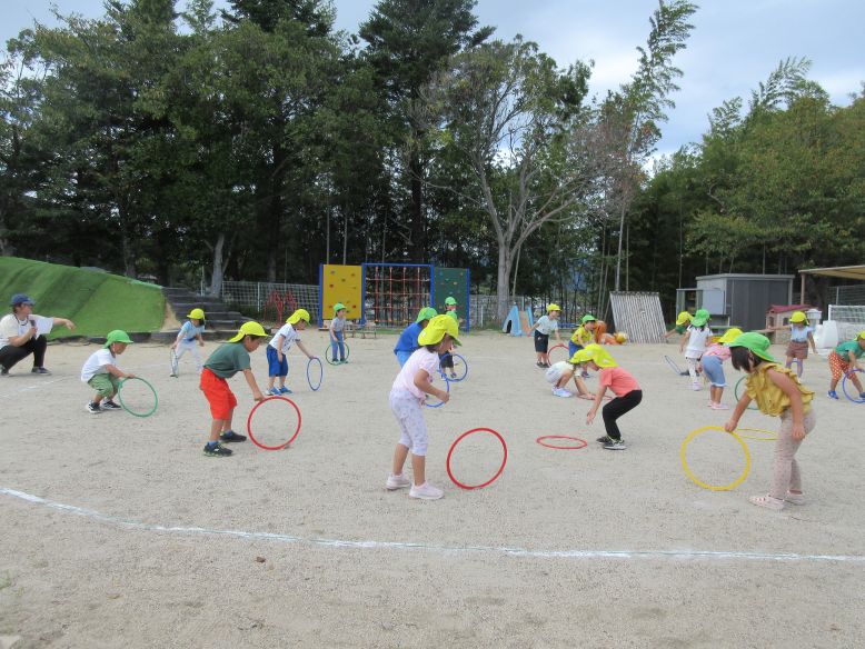 今日は体育教室の日でした。運動会に向けて、掛け声にも気合が入るこどもたち。保育者が「がんばるぞ~!」と声を掛けると、とても大きな声で「おー!!!」と声を出していますよ。少しずつ流れも分かってきて、音楽がかかるととても真剣な表情で練習に取り組む姿がとても素敵です。久々に暑い中、今日は2回の通し練習を頑張りましたよ。練習後の振り返りでは、頑張ったことや上手くいかなかったことを話し合いました。以前よりも運動会のイメージが持てている様子が見られるようになってきましたよ。