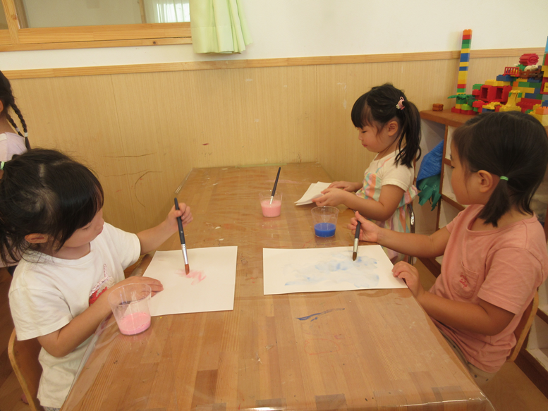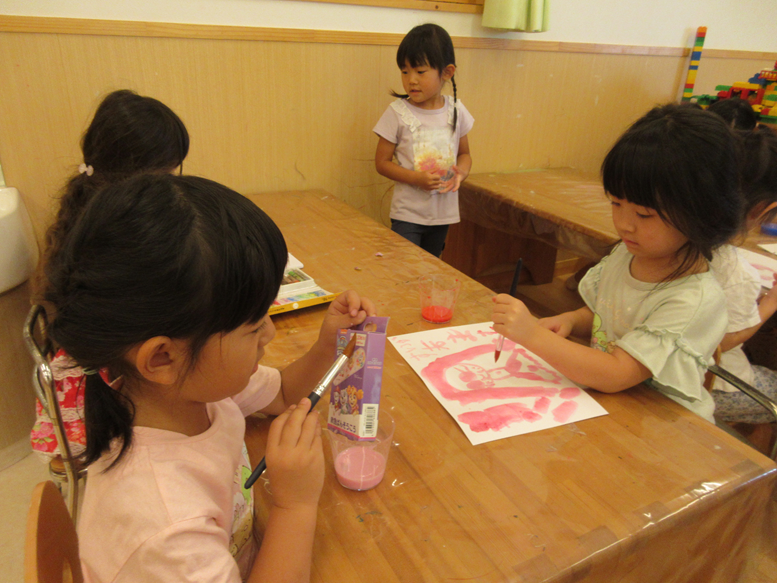 今日は、久しぶりに「えのぐしたい!」という声が出て、やりたい子で絵の具を楽しみました♪製作箱を色塗りする子、画用紙に絵を描く子、それぞれが自分たちの描きたいところに”ぬりぬり”してました。子どもたちからの”○○やりたい!”という思いを出来ることは実際にやってみたりしていきながら意欲的な気持ちをこれからも大事にしていきたいです。