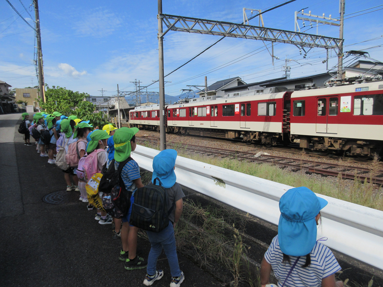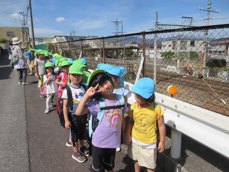 今日は、久しぶりに散歩に出掛けました。すみれ組と一緒に行きました。「すみれ組といくってことはどうしたらいいかな?」と聞くと「おにいさん、おねえさんだからまっすぐあるく!」「いっしょに手をつないではなさない!」「こっちだよって教えてあげる」とみんな自分が年上であることを意識しているみたいでした♪電車を見に行き、通ると「きたきた!ばいばーい!」「かぜがくるね!」と興味深々に見ていた子どもたちでした。久しぶりの散歩にいきいきしていました!また涼しい日には散歩に出掛けて秋ならではの虫や植物などを見つけたり秋の気候を感じたりしていきたいです。