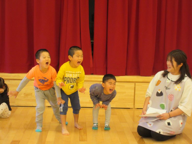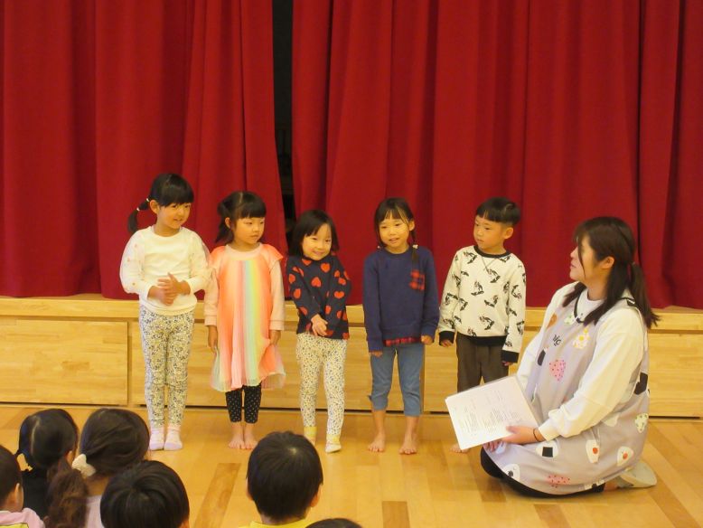 発表会の練習が始まりました。自分たちで決めた役で、保育者とセリフを確認しながら一通りの流れを練習しました。少し前から保育者が台本を朗読していたこともあり、何となくセリフを覚えている子も多く、役になりきって楽しむ姿が見られましたよ。最後にこどもたちに「どうだった?」と聞くと、「いいおはなしだった!」「おうちをつくるところがたのしかった!」「にげるのがすこしむずかしかった…」と、色んな感想を言い合っていましたよ。