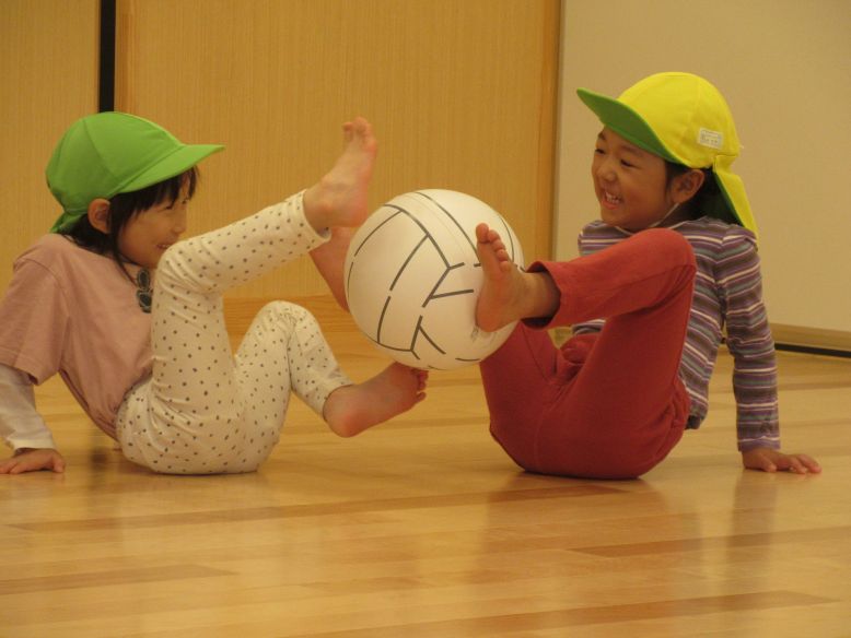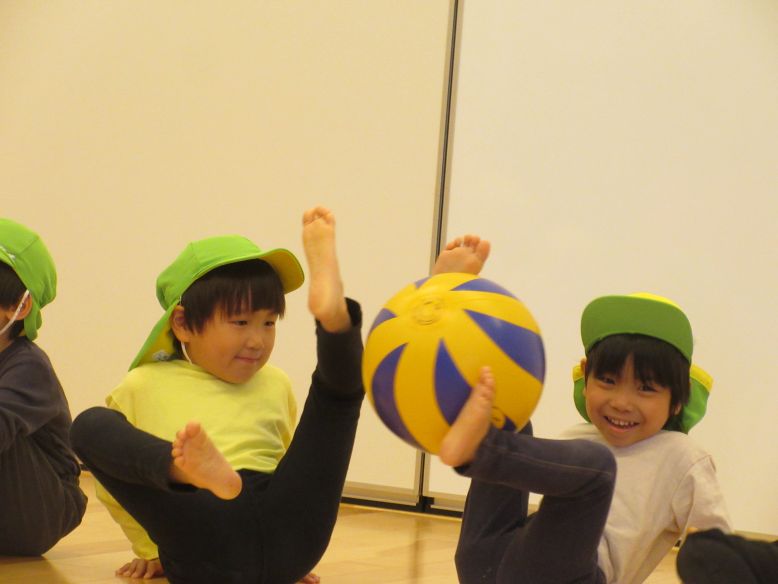 運動会後、初めての体育教室でした。今回はビーチボールを使って身体を動かしました。手だけでなく、足も使ってボールを回していきます。思ったより難しくて、ボールが落ちると大盛り上がりするこどもたちでした。