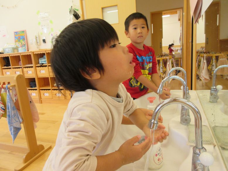 最近風邪気味の子が増えてきたので、こどもたちに手洗い・うがいの大切さについて話しました。しっかり話を聞いていたようで、外から帰ってきた時や食事前に手洗いとうがいを頑張っていますよ。両手で口に水を運んだり、ガラガラうがいは慣れていない子もおり、「どうやってやるの?」と保育者に聞きながら取り組む姿が見られます。これからも外で沢山遊んで沢山食べて、風邪に負けないゆり組さんを目指していけたらと思います。