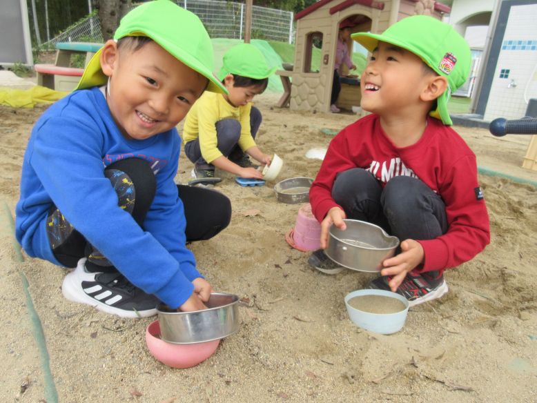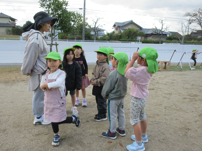 話し合いの後は園庭でたくさん遊びました。リスの置物にご飯を食べさせてあげたり、小さい組のお友だちのお世話をしたりしていましたよ。