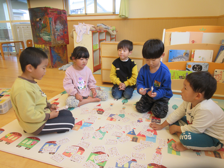 今日は、外や室内で好きな遊びを楽しみました。最近のゆり組さんは、集団遊びをすることも増えてきてます♪外では「おにごっこやりたい!」「かくれんぼやりたい!」とゆり組のみんなを誘う姿がありました!以前は鬼が急にたくさん増えていたりルールも曖昧でしたが、”鬼決めをして、タッチされたら鬼になる”というルールをしっかりと理解して楽しむようになりました。成長を感じます♪室内では、最近トランプを出しました!みんな、神経衰弱やババ抜きやたこやき、七並べなど以前から経験がある子が分からない子に優しく教えたりしながら楽しんでやっています!”みんなで遊ぶ”ことが多くなりました♪