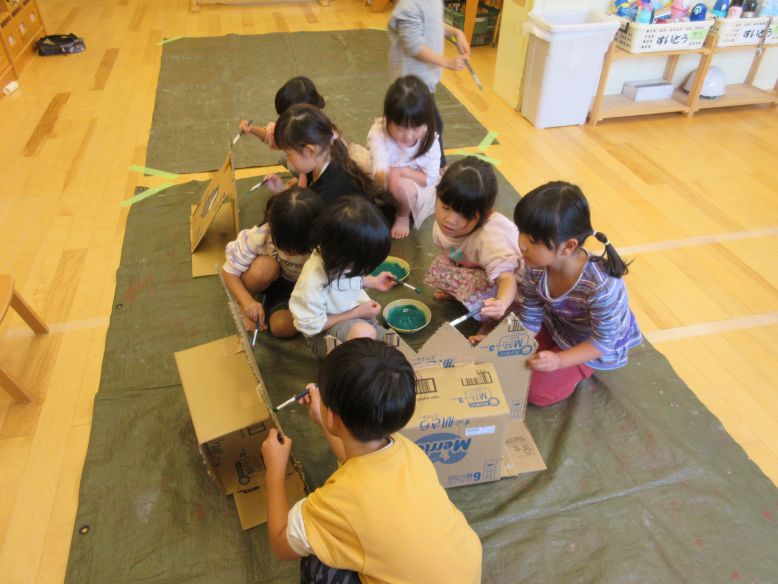 発表会に向けて、大道具を作り始めています。今日は背景に使う草や木の色を絵の具で塗りました。「何色混ぜたら茶色になるかな?」とこどもたちに聞くと、「緑と赤を混ぜるといいんだよ!」と教えてくれた子がいました。一緒に考えながら色を作り、筆を使って細かいところまで塗っていましたよ。
