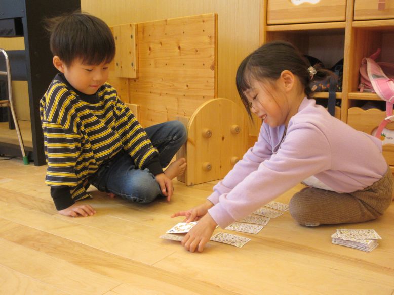 最近トランプで”たこやき”というゲームにハマっているゆり組さん。少し前までは神経衰弱を楽しむことが多かったですが、ルールが分かる子が友だちに教えてあげながら色んな遊び方を楽しむようになってきました。ルールが分かると楽しさも倍増するようで、みんな夢中になって楽しんでいますよ。
