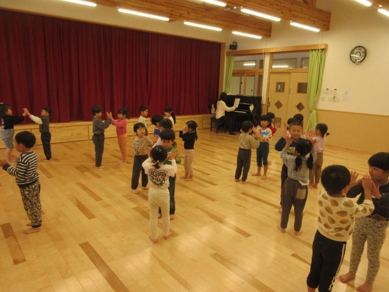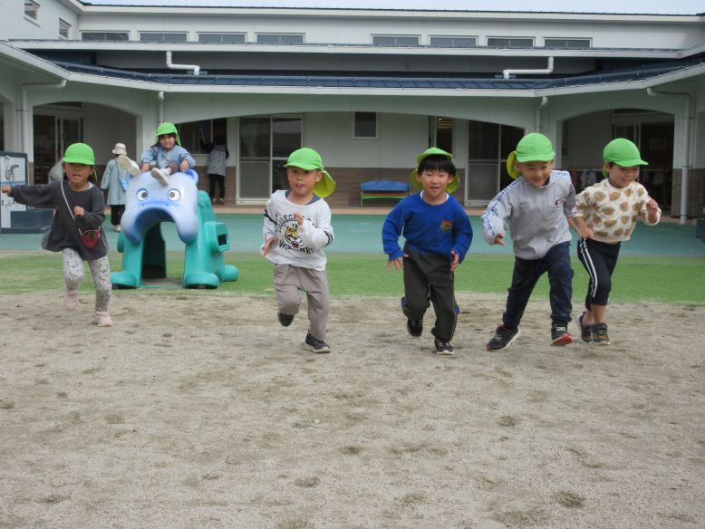 今日は、リトミック教室に参加した後、園庭でかけっこやかくれんぼなどをみんなで楽しみ、たくさん身体を動かしました。