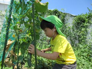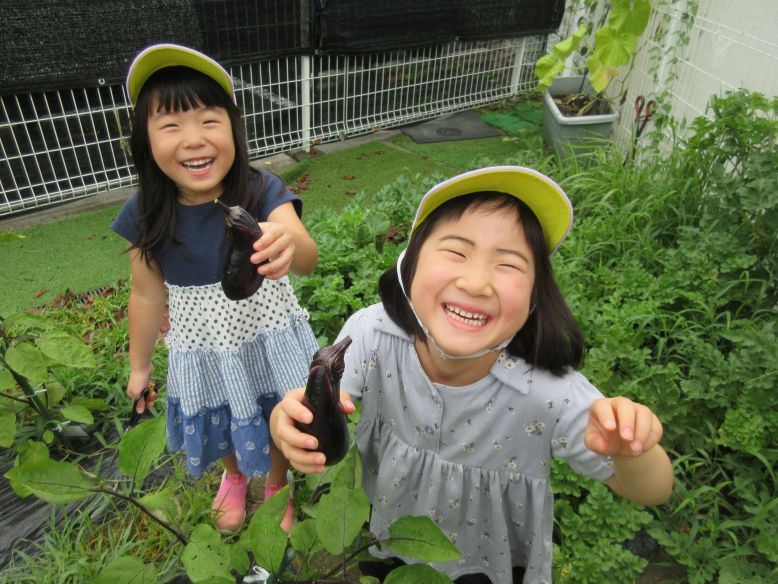 野菜の収穫をしました!引っ張って野菜を収穫しようとする子もいたのですが、「こうやって優しく取るんだよ」とこども同士で伝え合い収穫を楽しんでいます。「こんなにも大きくなってる!」「おいしそう!」と収穫しながら話にも花が咲いていますよ。何して食べるか楽しみだね!