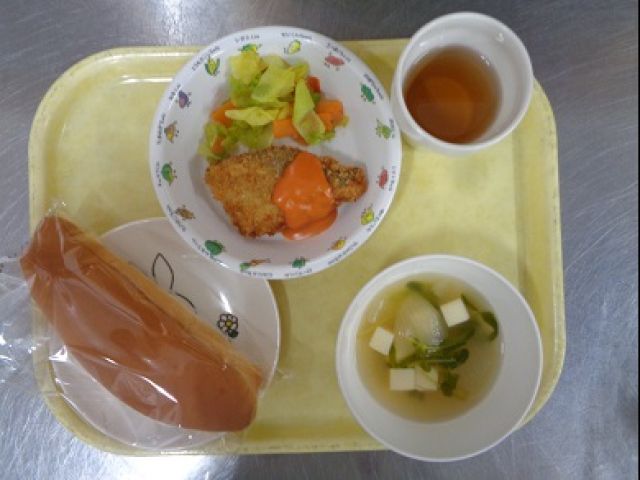 『ホキのフライ』『カレーキャベツ』を自分でパンにはさんで食べました。大きなお口で「ガブリ!」楽しそう食べていました。