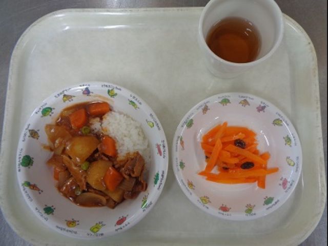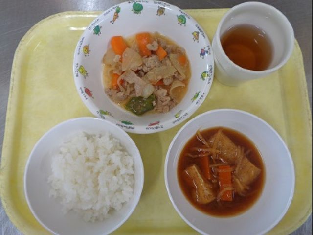 『冬瓜のスープ』にんじん・とうがん・わかめが入ったコンソメ味のスープです。冬瓜は、口に入れるとトロっと溶けていきます。