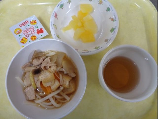 『きのこうどん』豚肉・油揚げ・にんじん・まいたけ・しめじ・えのきたけ・玉ねぎが入りました。園で初めて「まいたけ」を使用しました。舞茸は「山で舞茸見つけたら村人が喜び、舞い上がり踊った」と言う伝説があるそうですよ。