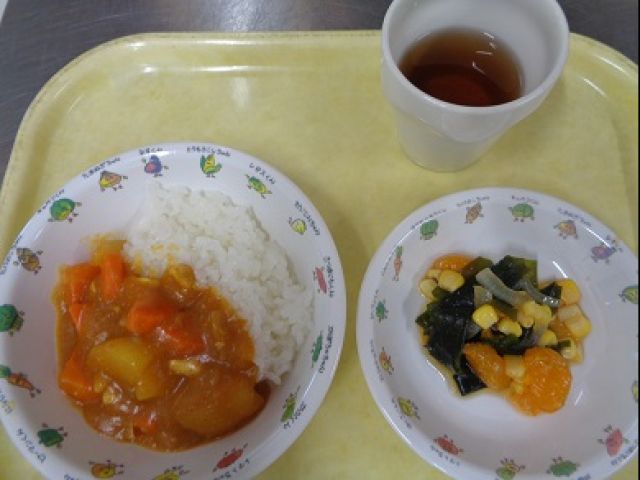 『わかめのサラダ』わかめ・玉ねぎを茹で軽く絞ってコーン缶・みかん缶と合わせ、醬油・サラダ油・砂糖・塩こしょう・酢で作ったドレッシングで和えました。