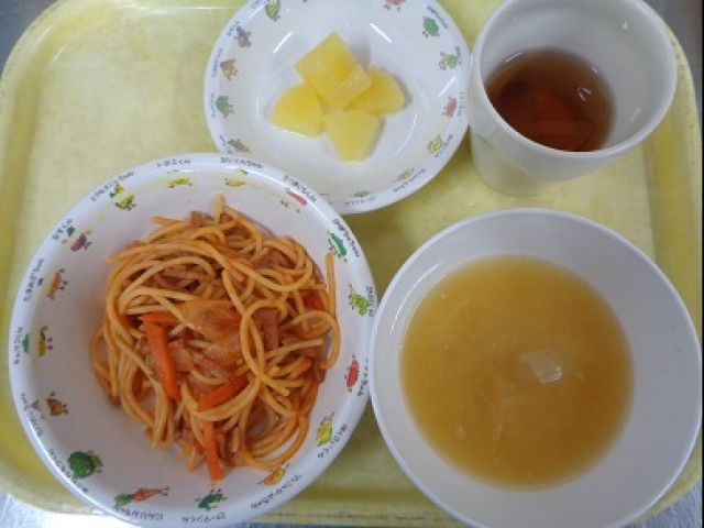『イタリアンスパゲティ』玉ねぎ・にんじん・ベーコン・グリンピースを炒め、トマトケチャップ・ウスターソース・塩こしょうで味付けし、茹でておいたスパゲティと絡めました。