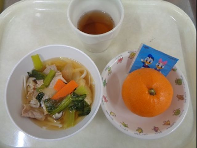 『肉うどん』豚肉・油揚げ・人参・玉ねぎ・しめじ・小松菜が入りました。