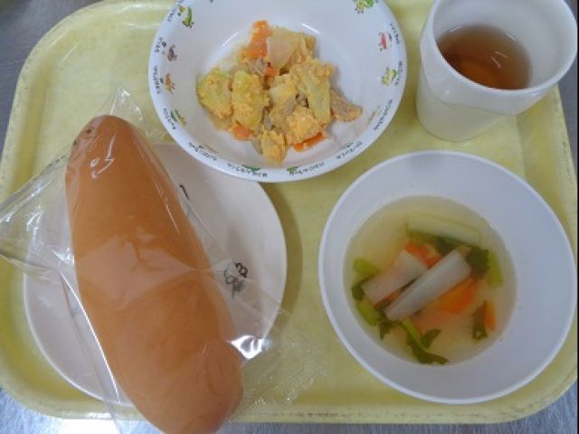 『コーンスープ』クリームコーン缶・にんじん・たまねぎを煮込み、コンソメスープのもとで味を調えました。